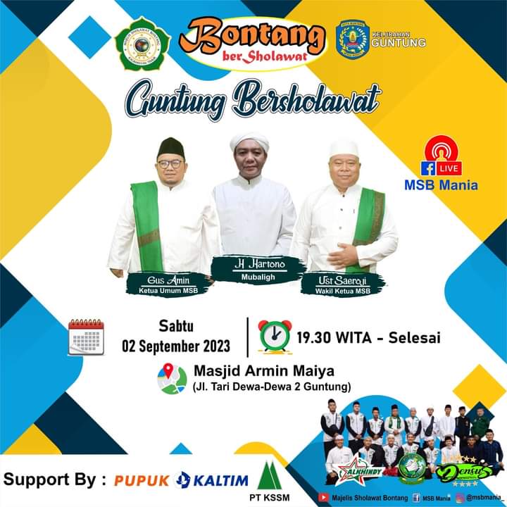 Bontang, 31 Agustus 2023. Dalam upaya untuk meriahkan momen spesial, Majelis Sholawat Bontang (MSB) akan menggelar acara Guntung Bersholawat Pada Sabtu, 02 September 2023 pukul 19.30 Wita. Acara ini akan diadakan di Masjid Armin Maiya Guntung, yang beralamatkan di Jl. Tari Dewa Dewa 2 Guntung.